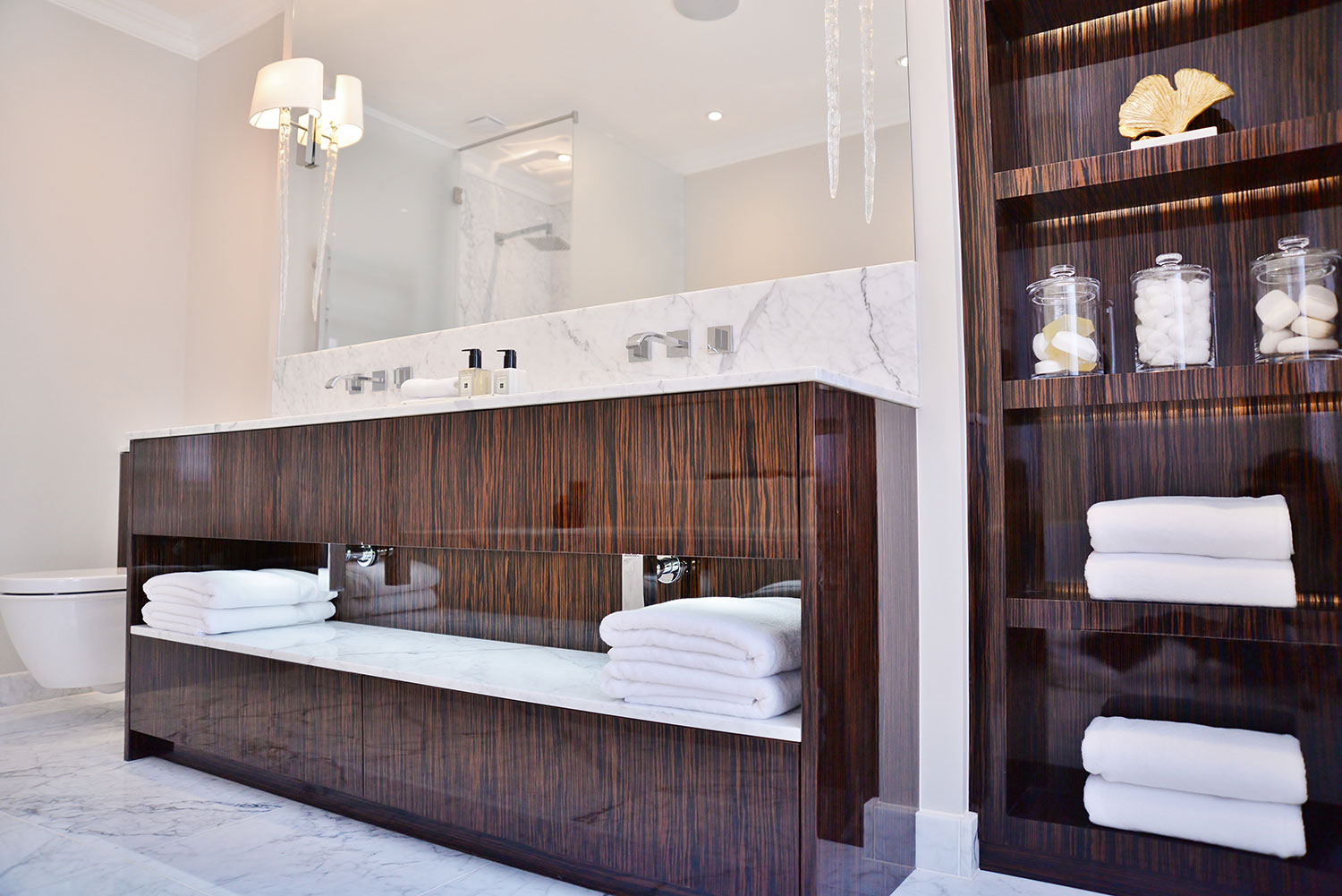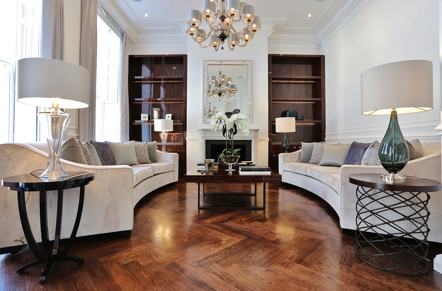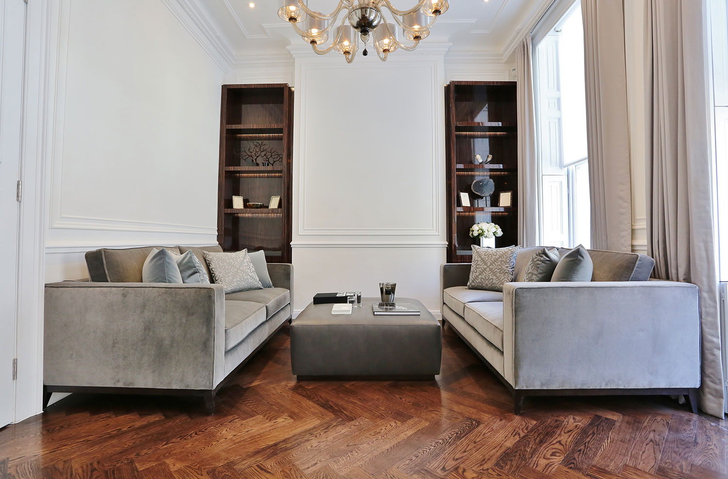 This impressive double-fronted property in prime London location, was in need of restoring from faded grandeur to its' former glory. As the house is listed, there was a large element of reparation and restoring, before we could even think about bringing in new aspects to the interiors. Old fireplaces needed to be reinstated and the parquet flooring brought back to life. KR Interior Design were asked to re-design every inch of this house to be the perfect 'home away from home' for the family who bought this property as their London address. The family's style is luxurious, classic and glamorous- which is reflected in the high gloss Macassar wood joinery, parquet flooring and luxurious silk fabrics gracing everything from deep buttoned headboards to scatter cushions.
