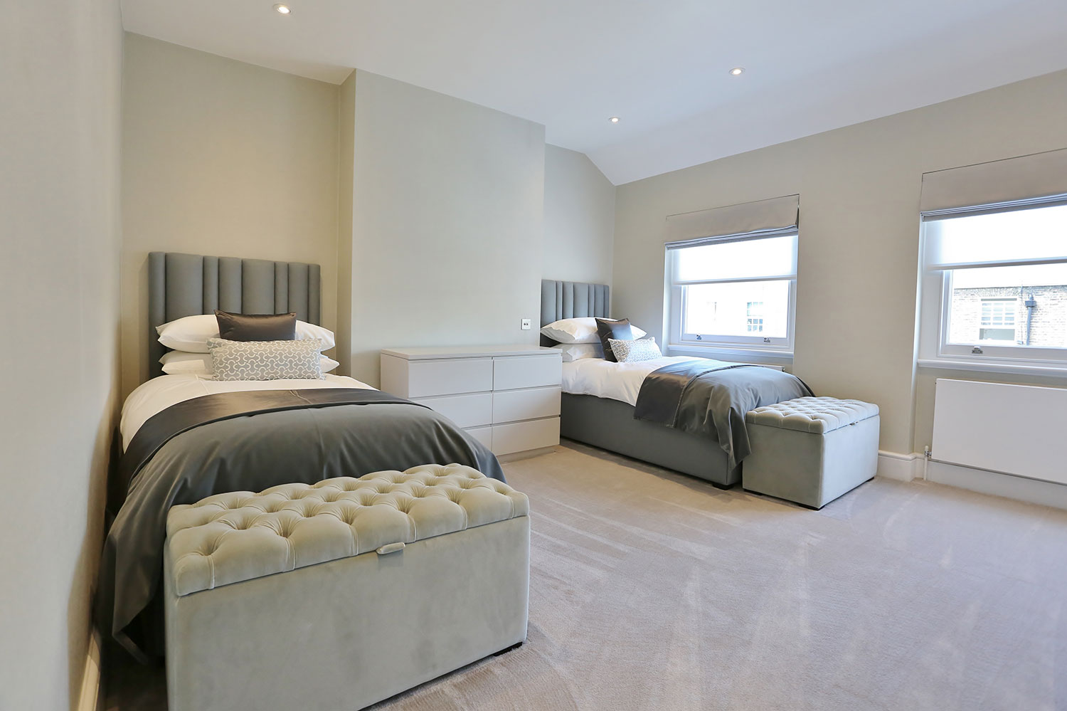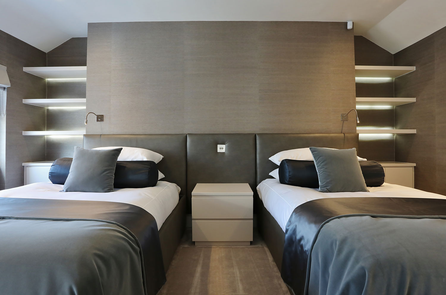 The brief for this project was to create a family home that was functional and personal to them, to make them feel comfortable during their frequent trips to the UK. The children's bedrooms were designed in subtle blues for the boys, future-proofing them by maintaining an overall grown-up feel. The little girls' room being the only space that feels distinctly child-like, but beautiful with Bambizi wall stickers and a whimsical day-bed.