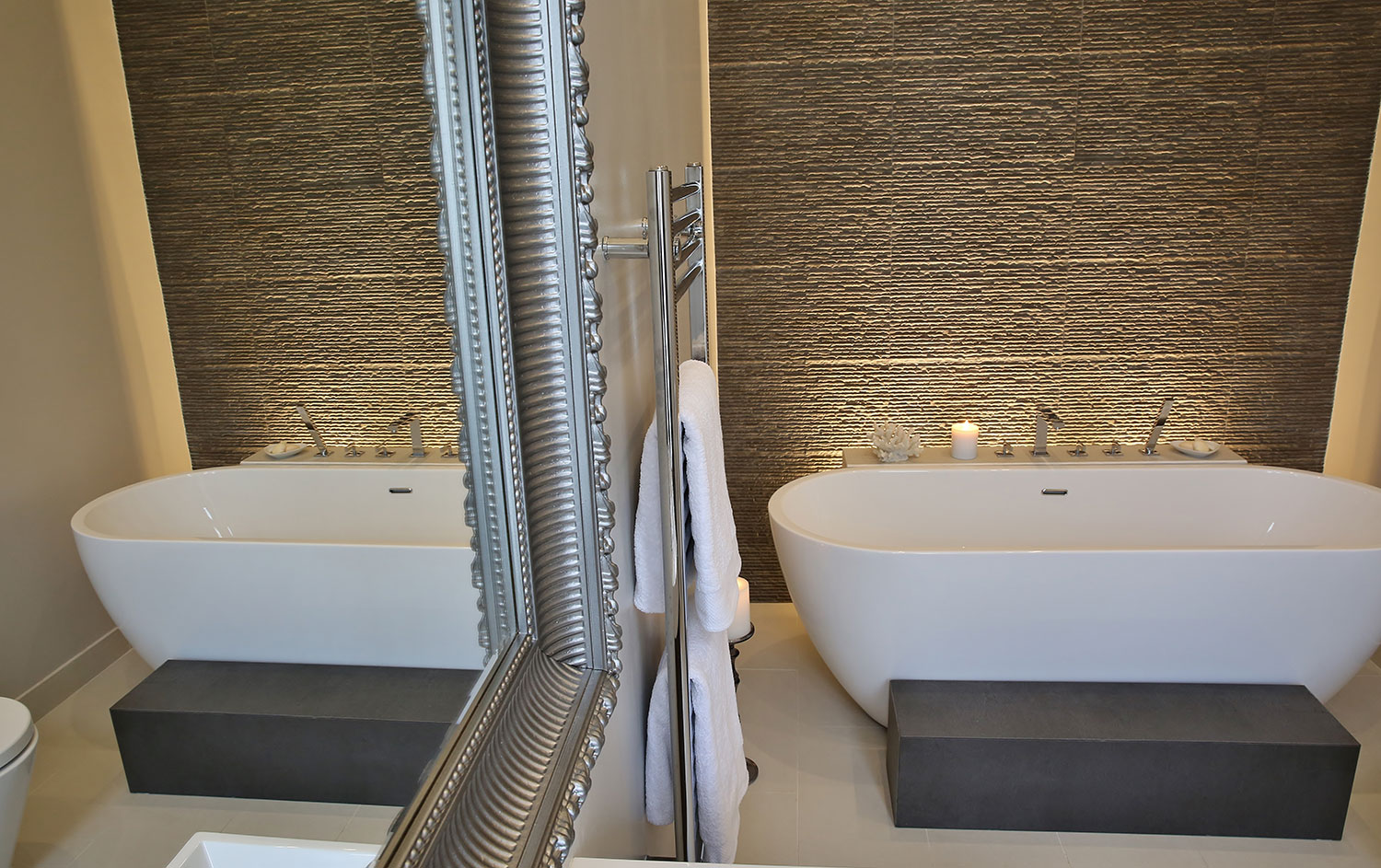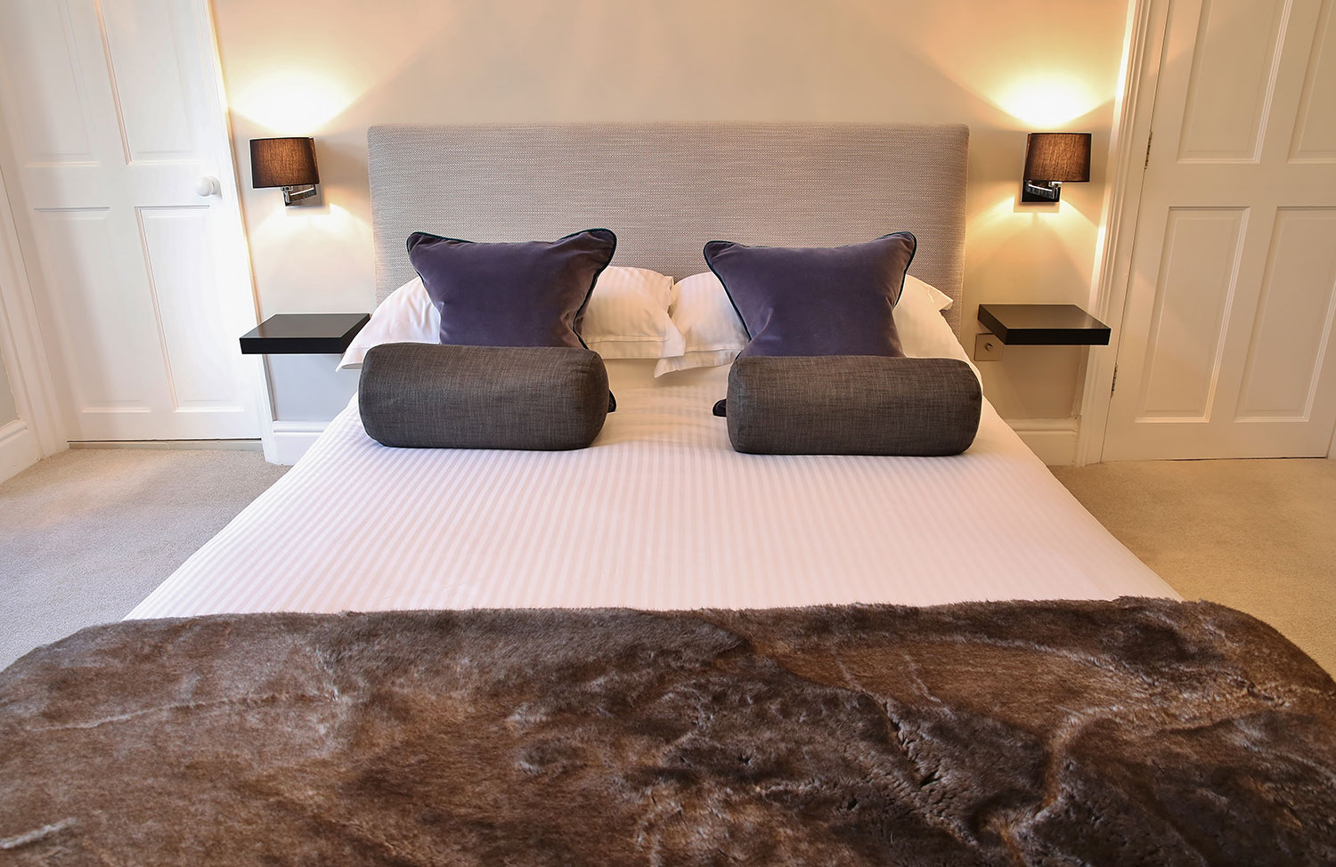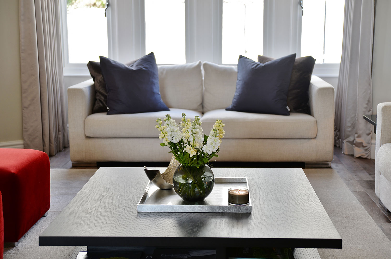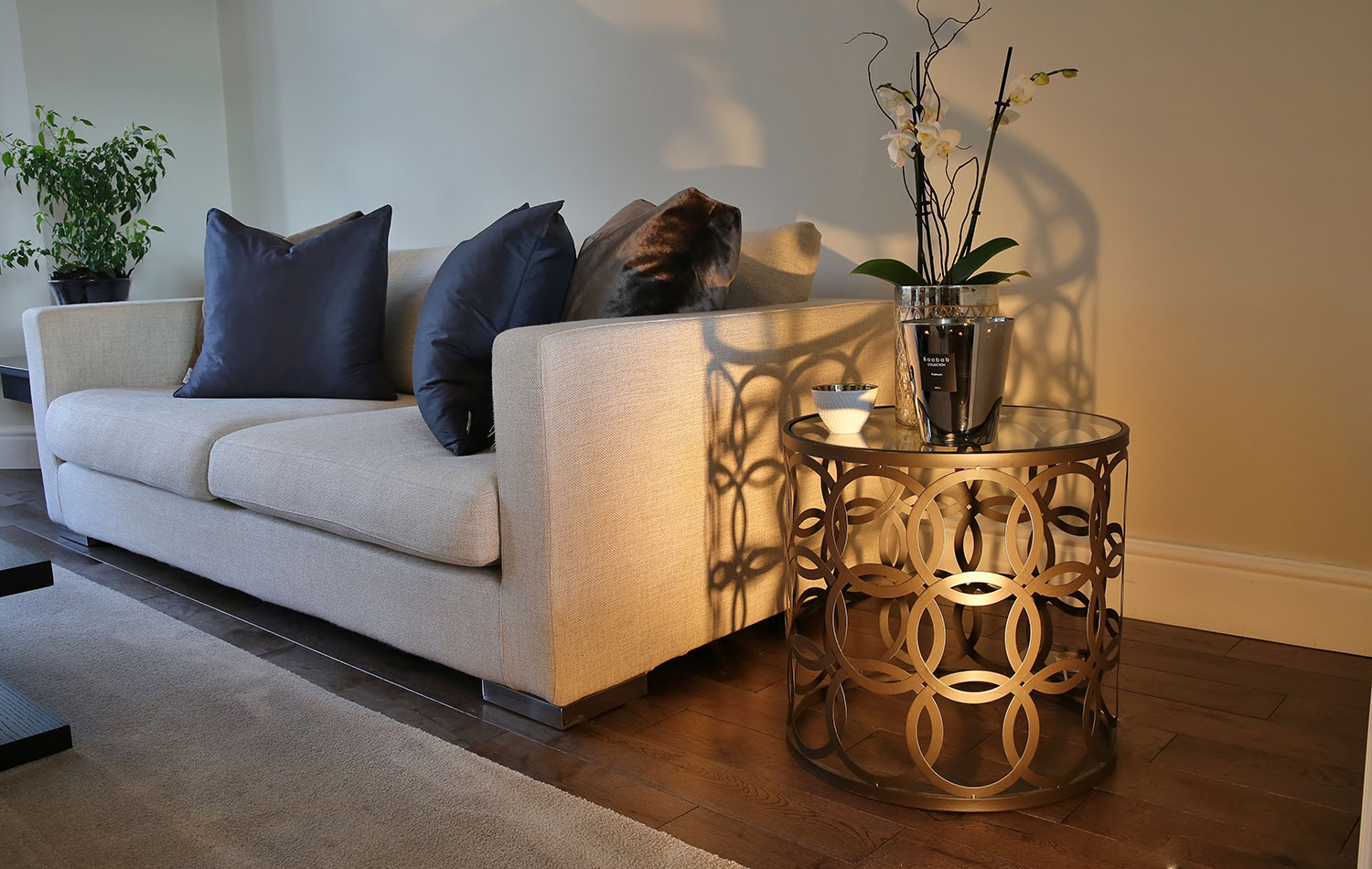 A grey smoked oak flooring was laid throughout the ground floor and a bespoke large rug was made for the sitting room to offer comfort and a touch of luxury. The bathrooms were designed to be a place to indulge and under floor heating was included along with accent lighting behind the bath to illuminate the feature textured wall. A range of modern oriental style furniture completed the look.